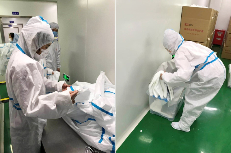 汤俊飞介绍说:“生产医用防护服与生产民用防护服是完全不同的,这是我从未接触的领域,所以我也在向专业人士学习。”医用防护服的生产不仅对于生产环境标准严格,需要按照无菌环境建设,将空气中的微粒子、细菌等污染物排除,确保制作时不受污染,而且在面料、工艺方面也有很高要求。从面料辅料的采购、打样,到调试机器、缝纫,每一项流程都要严格按照国家标准出发,尤其让汤俊飞及技术人员感到头疼的是对于缝纫的特殊要求,他们根据不同类型的面料经过不断地调整测试后,终于将胶条机调试成功。技术难关被逐个攻破,生产也进入加速阶段。