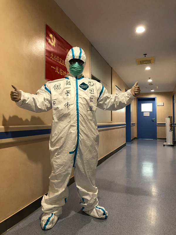 远在武汉的殷晋伟医生知道这些事情后深为感动,为了表达对ag亚博科技|yabo sports|有限公司官网物业人的感激之情,特意在防护服上写了“感恩ag亚博科技|yabo sports|有限公司官网”并拍照发给张伟。他说,感恩ag亚博科技|yabo sports|有限公司官网物业对我家庭细致入微的照顾,彻底解除了“后方之忧”,使他在战疫一线能够安心工作。